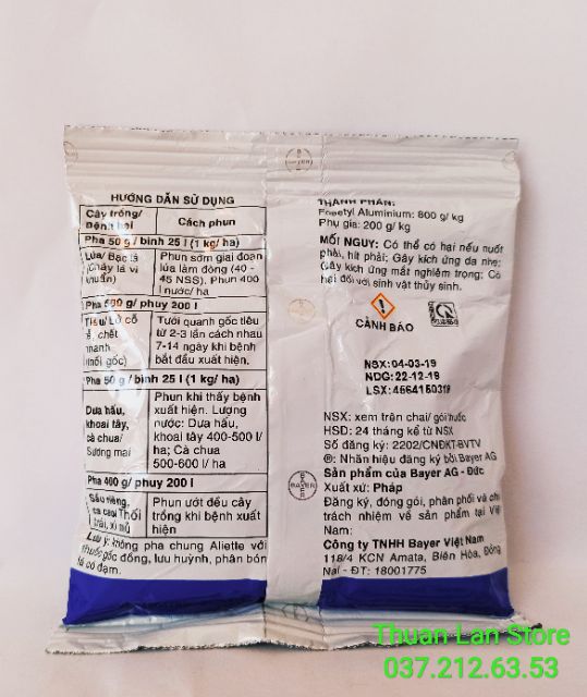 Thuốc Trừ Bệnh Cây Trồng Aliette 800WG (gói 100g)Aliette 800WG là loại thuốc đặc trị vi khuẩn có tính nội hấp, có tác dụng bảo vệ và diệt trừ; thẩm thấu nhanh, lưu dẫn 2 chiều, vận chuyển hướng ngọn và rễ.