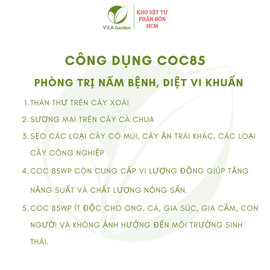 - Công dụng:Coc 85WP là thuốc phòng trị nấm bệnh, diệt vi khuẩn căn bản từ gốc đồng qua hệ thống thân, lá và rễ dùng để phòng trị các bệnh hại như: Thán thư trên cây xoài, sương mai trên cây cà chua, sẹo các loại cây có múi, cây ăn trái khác, các loại cây công nghiệp, … Ngoài phòng trị ra, Coc 85WP còn cung cấp vi lượng đồng giúp tăng năng suất và chất lượng nông sản.Coc 85WP ít độc cho ong, cá, gia súc, gia cầm, con người và không ảnh hưởng đến môi trường sinh thái.