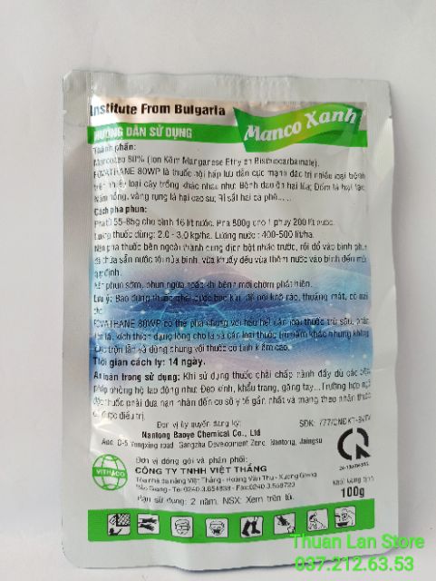 Manco Xanh SẠCH BỆNH – XANH CÂYThành phần: Mancozeb (Ion Kẽm Manganese Ethylen Bisthiocarbamate) 80%, Chất phụ gia 20%.