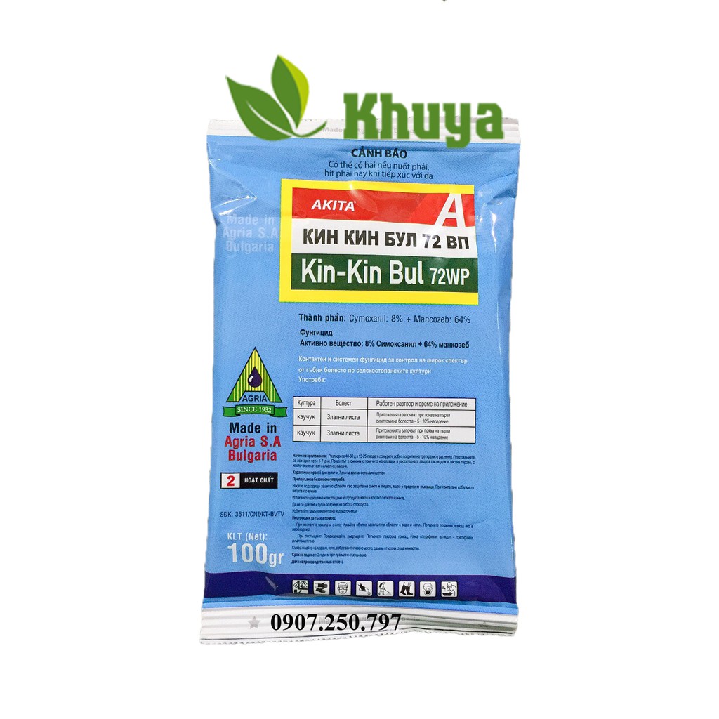 Thuốc trừ bệnh Kin Kin Bul 72WP 100grKin Kin Bul gói 100g là chế phẩm trừ bệnh hỗn hợp giữa 2 hoạt chất Macozeb và Cymoxanil có tác động tiếp xúc nội hấp và lưu dẫn mạnh. Kin Kin Bul chuyêntrừ bệnh rỉ sắt, thối cuống, rụng trái (thán thư) trên cà phê, điều. Vàng lá, loét mặt trên cao su và các bệnh sương mai. Thán thư, đốm nâu trên 1 số cây trồng.