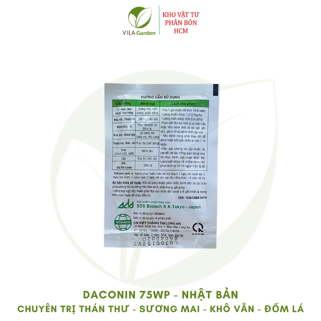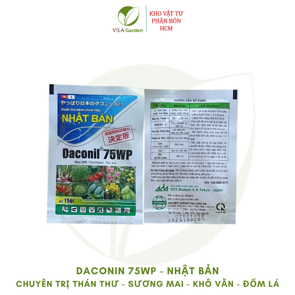 Thuốc Trừ Bệnh Daconil 75WP gói 15g, Phòng trừ sương mai, phấn trắng, đốm lá, thán thư... cho cây trồngXuất xứ: Sản phẩm chính hiệu của SDS Biotech K.K.Tokyo - Japan.
