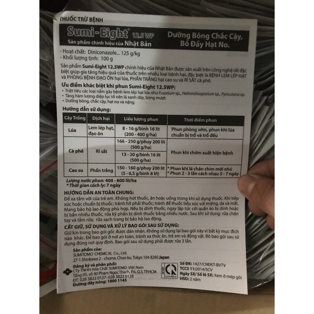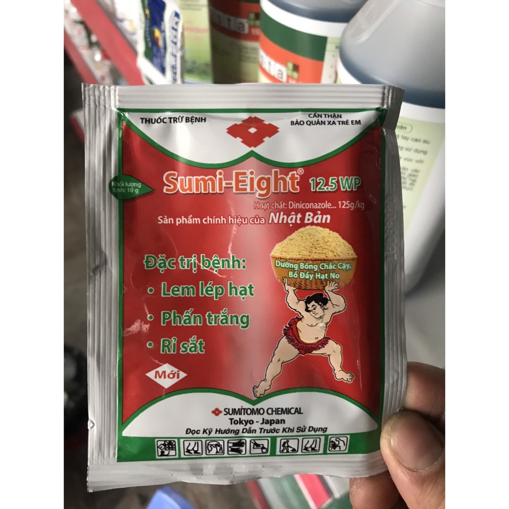 Sumi-Eight 12.5wp là sản phẩm chính hiệu của Nhật Bản. Được nhiều nhà khoa học trên toàn thế giới khuyên dùng.Với công thức đặc biệt sumi-eight 12.5wp giúp đánh bay được các bệnh hại do nấm gây ra như: Lem lép hạt và đạo ôn ở lúa, Rỉ sắt ở cây cà phê và phấn trắng ở cao su.