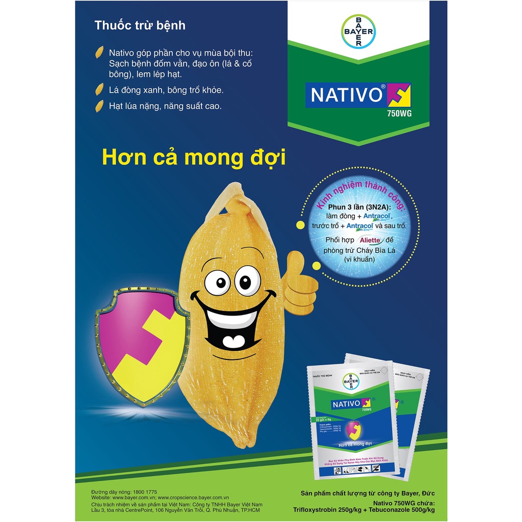 Thuốc trừ bệnh NATIVO 750WGCông dụng : Nhờ sự kết hợp chặt chẽ của 2 hợp chất Trifloxystrobin và Tebuconazol, với sức mạnh tổng hợp, thuốc Nativo 750WG thách thức mọi nấm bệnh. Do đặc tính tiếp xúc và lưu dẫn cao, có tính lan toả trong mô cây rất mạnh nên thuốc nhanh chóng bảo vệ cả 2 mặt lá cây, kể cả các bộ phận khác của cây ở bên trong lẫn bên ngoài dù không được tiếp xúc với thuốc. Vì vậy thuốc có tác dụng tối ưu, phòng và trừ triệt để, tận gốc tất cả các bệnh nấm hại cây trồng. - Thuốc có tác động ức chế mạnh quá trình sinh tổng hợp Ergosterol (do hoạt chất Tebuconazol) và quá trình hô hấp của các nấm gây bệnh (do hoạt châtTrifloxystrobin) làm nấm bị tiêu diệt nhanh chóng song không làm ảnh hưởng đến cây trồng. Thuốc có tính an toàn cao, ở dạng bột thấm nước rất dễ sử dụng, có liều lượng sử dụng thuốc thương phẩm trên một đơn vị diện tích rất ít (chỉ 0,12 kg/ha lúa). Nativo 750WG tác dụng đặc trị đồng thời tất cả các bệnh nấm chủ yếu hại lúa như bệnh đạo ôn (lá và cổ bông), bệnh khô vằn, bệnh vàng lá, bệnh lem lép hạt… cũng như các bệnh nấm hại cây trồng khác.