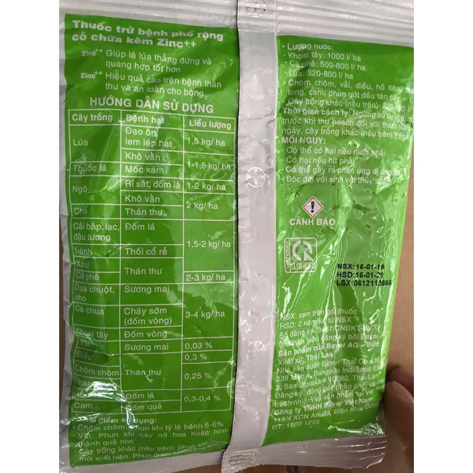 - Thuốc phòng trừ bệnh phổ rộng, dạng bột thấm nước, có độ phủ tốt và có độ bám dính cao trên bề mặt lá khi phun, còn cung cấp vi lượng kẽm(Zn++) cho cây trồng giúp phát triển xanh tốt, tăng năng suất và chất lượng nông phẩm.