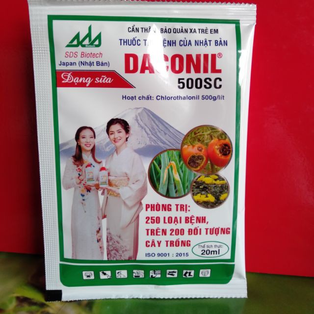 Gói loại mới năm 2019, dạng sữa dễ hoà tan 20 ml (loại cũ 15gr). Xuất xứ: Nhật. Đóng gói tại Việt Nam.Daconil phổ tác dụng rộng, trừ được nhiều loại bệnh như phấn trắng, mốc sương, đốm lá, thán thư, đạo ôn, khô vằn.. . trên nhiều loại cây trồng như cam, quýt, chanh, hoa hồng, cây cảnh...