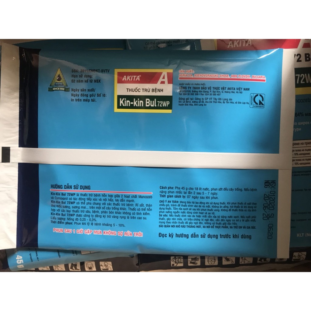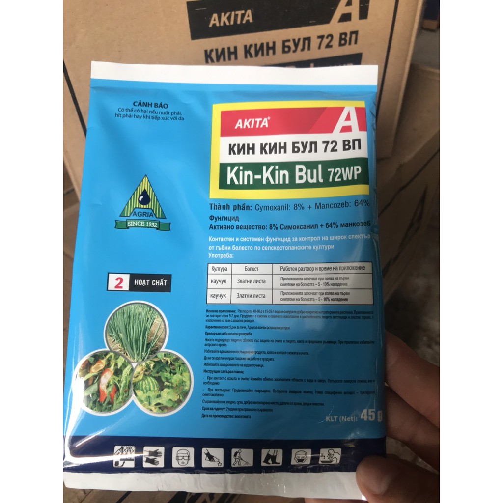 - Kin Kin Bul 72WP là chế phẩm trừ bệnh hỗn hợp giữa 2 hoạt chất Mancozeb và Cymoxanil có tác động tiếp xúc nội hấp và lưu dẫn mạnh.