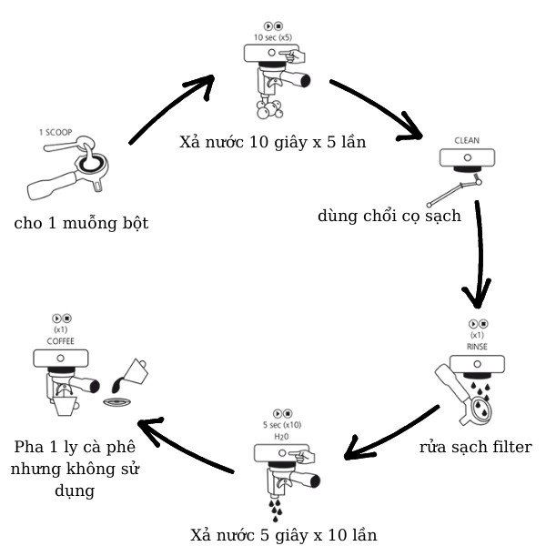 - Chuẩn bị: filter mù(không có lỗ). 1 muỗng bột vệ sinh Cafetto EC2.