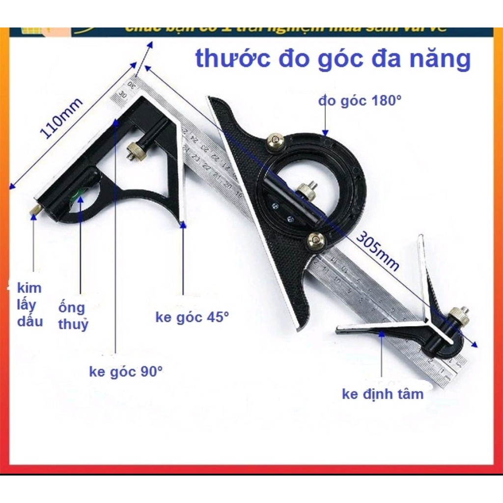 -Thước dài 30cm và 60cm làm bằng thép không gỉ, kết hợp với 3 bộ phận ke góc - cân bằng - định tâm bằng chất liệu hợp kim nhôm kết hợp nhựa cứng ABS độ bền cao, có thể tháo lắp tùy mục đích sử dụng-Thước được tích hợp nhiều chức năng như ke góc, đo góc, đo chiều sâu, kẻ vạch, lấy dấu, định tâm, cân bằng ngang - dọc - song song... với độ chính xác cao, giúp tiết kiệm thời gian