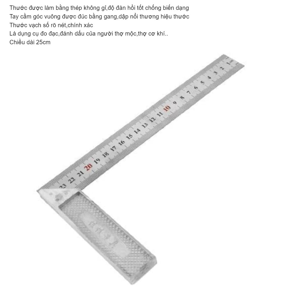 Thước vuông 90 độ là dụng cụ đo đạc đánh dấu không thể thiếu của những người thợ mộc,thợ cơ khí,thợ sắt kỹ nghệ..hay người thợ may. Thước được làm bằng thép chống gỉ,độ đàn hồi tốt chống biến dạng. Tay cầm góc vuông được đúc bằng gang,dập nổi thương hiệu thước. Thước vạch số rõ nét,chính xác. Là dụng cụ đo đạc,đánh dấu của người thợ mộc,thợ cơ khí..Các đặc điểm, thông số kỹ thuật của sản phẩm
