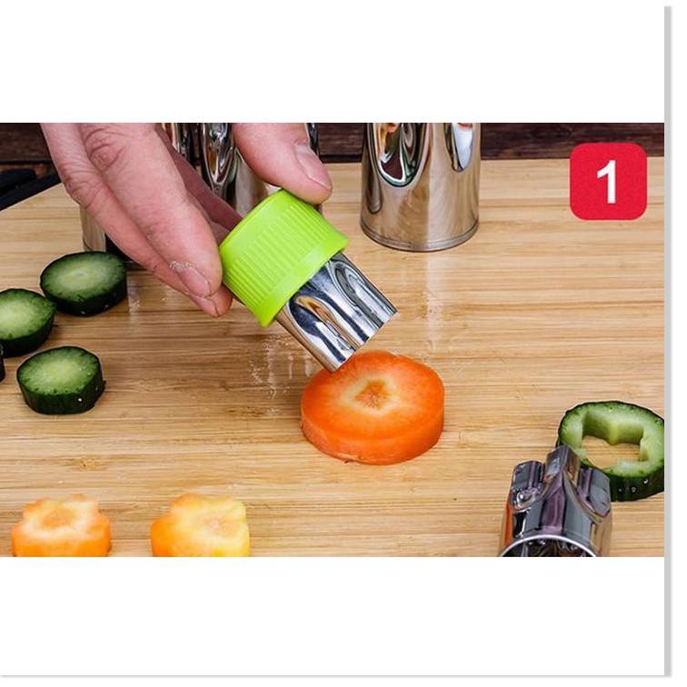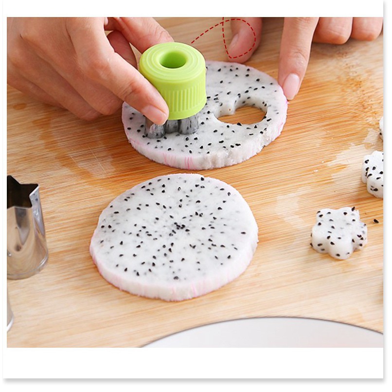 👉 Việc bạn cần làm đơn giản chỉ là ấn khuôn vào lát hoa quả có sẵn ( dày, mỏng tùy món), lấy ra thì có ngay các loại hoa đẹp mắt