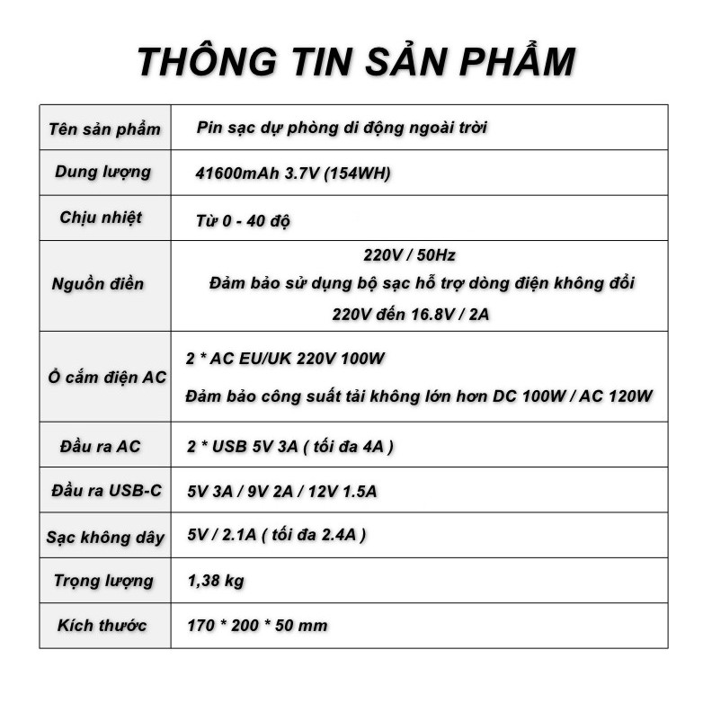 - Nguồn điện: Bộ tích trữ điện có công suất nguồn mạnh mẽ được nâng cấp, 41600mAh, tích hợp thêm cổng USB, Type-C và DC / AC, dự phòng điện khẩn cấp hoàn hảo cho gia đình, du lịch, cắm trại, hàng ghế sau trên những chuyến đi đường dài.