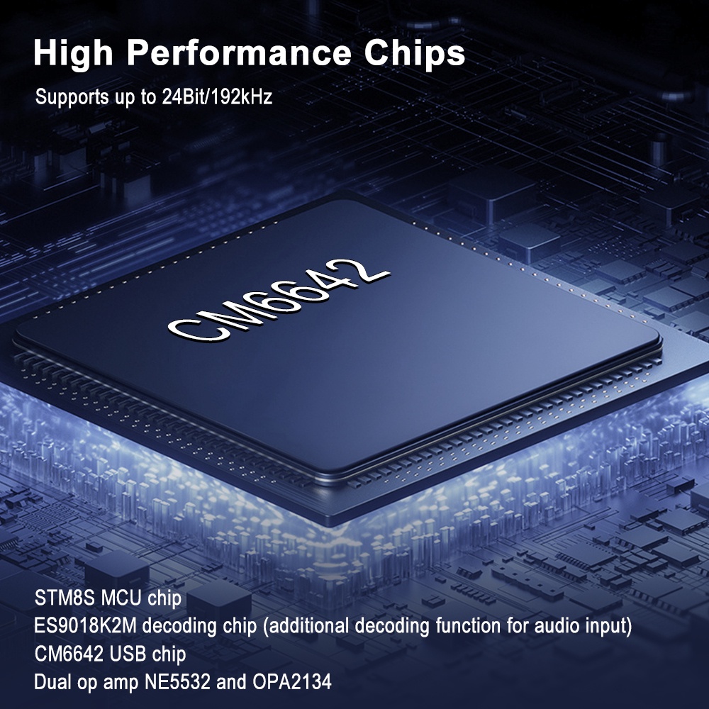 Chipset: STM8S MCU + ES9018K2M + CM6642 + đôi OP amp NE5532/OPA2134