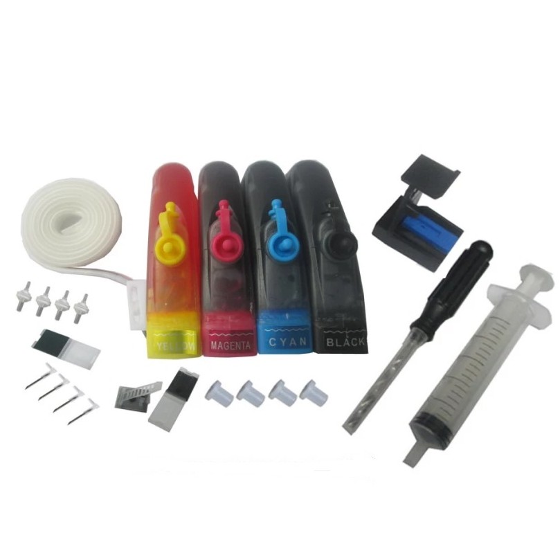 2, Lắp bộ tiếp mực ngoài vào (Bộ tiếp mực ngoài bao gồm: 4 bình chứa mực, dây dẫn mực, Gioăng nhựa, mấu nối, khoan, và reset mực…)
