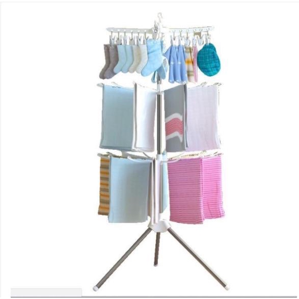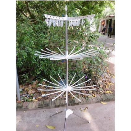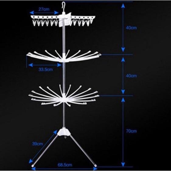 - Cây phơi quần áo 3 tầng với 3 giá phơi đồ cực kì chắc chắn và tiện dụng, có thể gập gọn khi không sử dụng, móc trùm có thể tháo rời làm 1 móc treo tác biệt