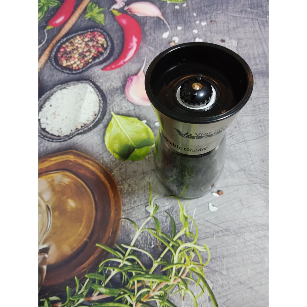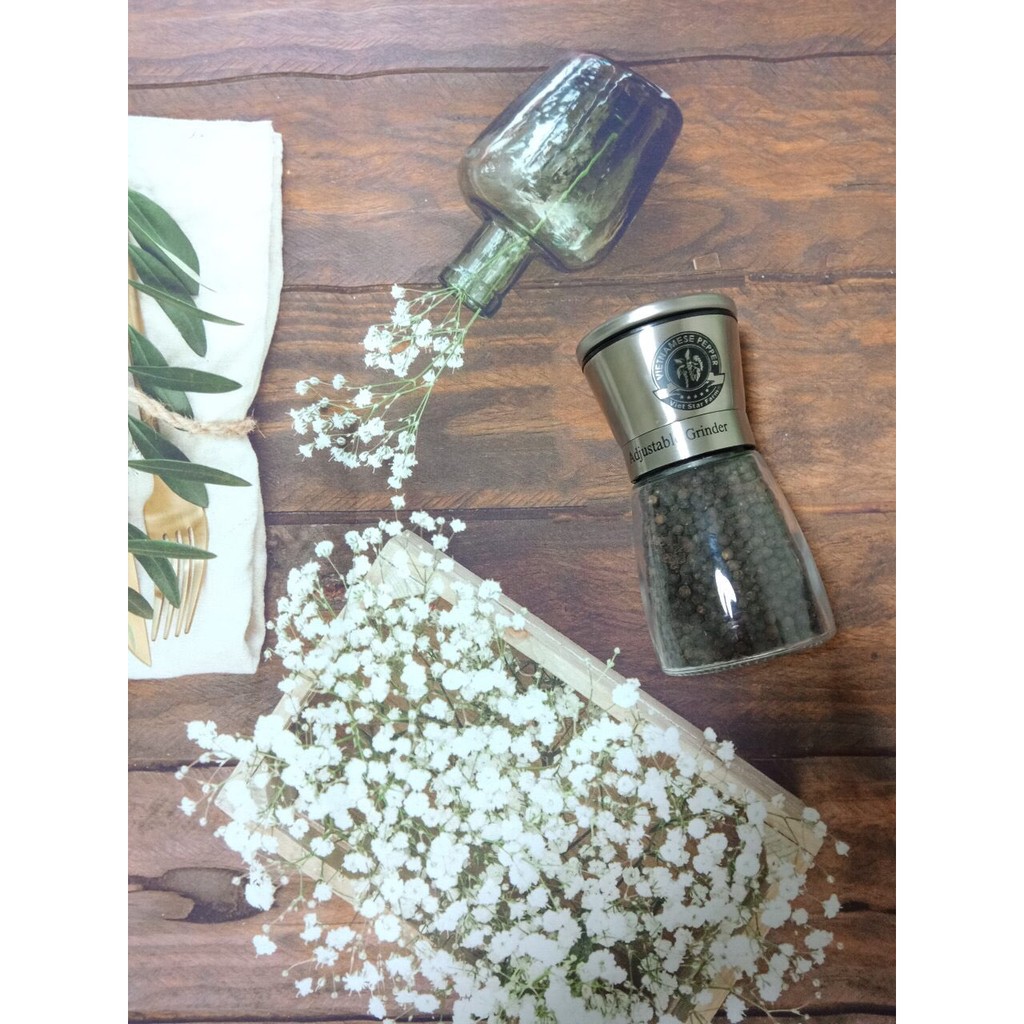 - Trọng lượng gr, Đóng gói trong hũ thủy tinh cao cấp, nắp hũ chính là cối xay tiêu mini