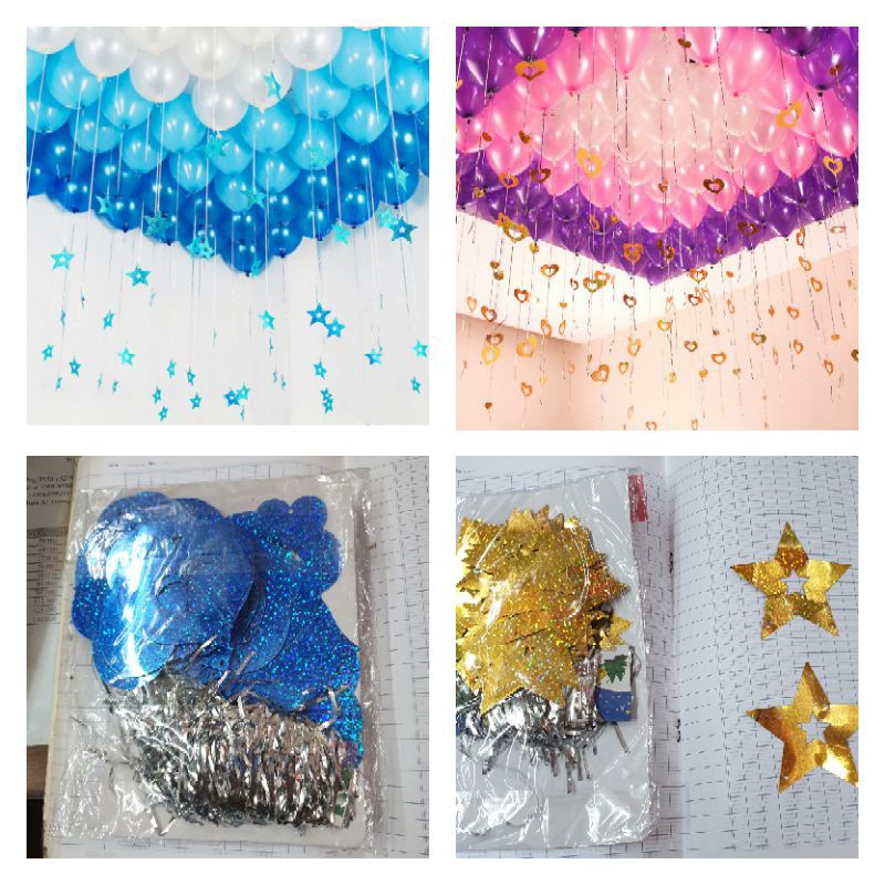 Sản Phẩm gồm 50 Sao hoặc 50 Tim và dây ruy băng để cột vào đuôi bong bóng đã bơm aan84Cách Dùng: lấy dây ruy băng xỏ qua Sao hoặc Tim sau đó cột đầu còn lại vào đuôi bong bóng đã bơm sẵn. Dùng keo bóng dán bóng lên trần tạo hiệu ứng bóng bay trang trí cho bữa tiệc thêm lung linh.