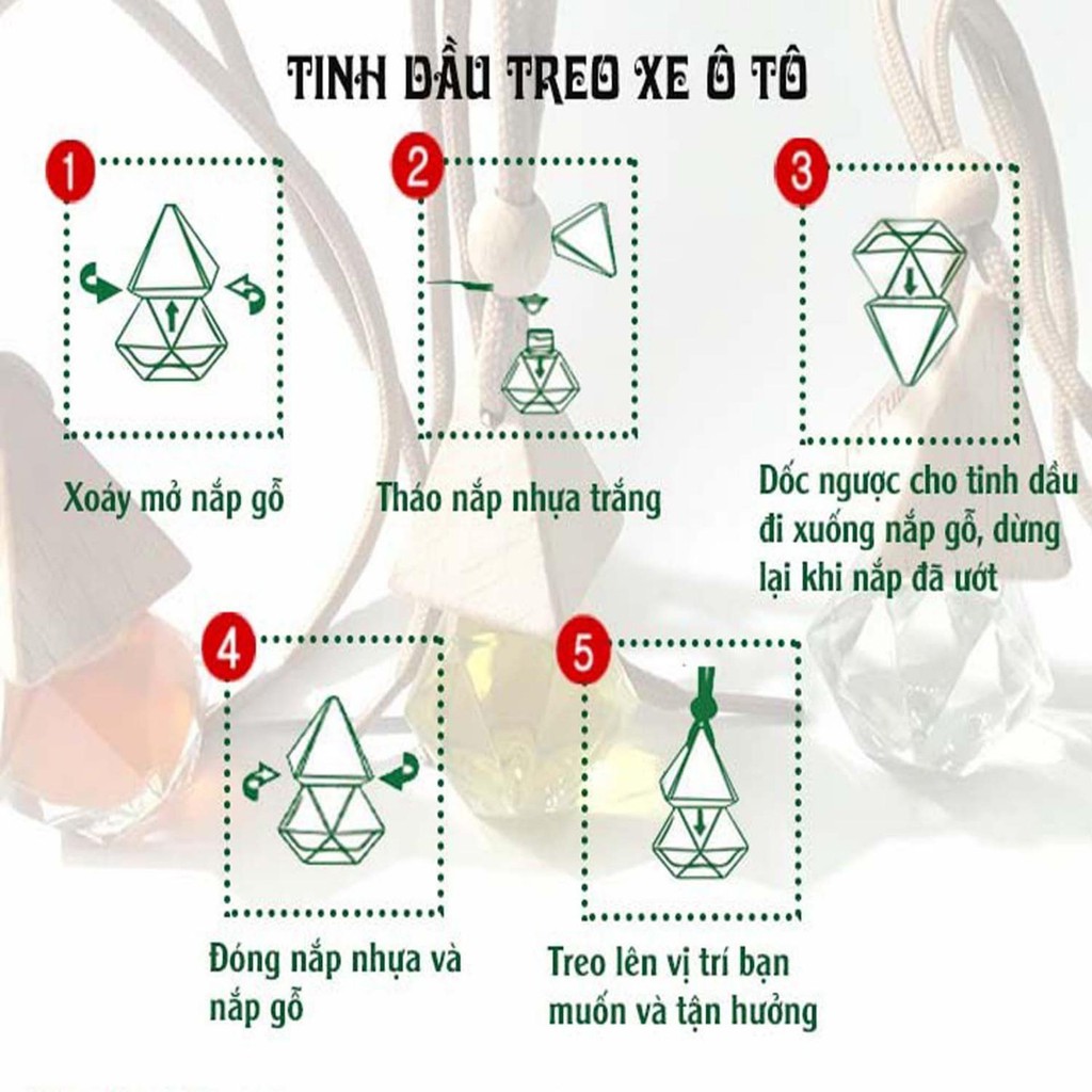 - Treo trong xe ô tô, nhỏ nhắn, xinh xắn rất tiện lợi cho các bạn khi tham gia giao thông, mùi hương tinh dầu có thể giúp loại bỏ các mùi lạ, mùi thuốc lá, mùi khó chịu trên xe.