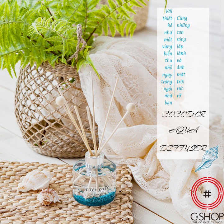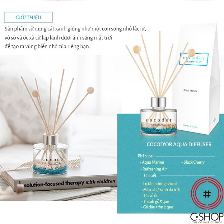 👉Đặc biệt khác so với các loại tán hương khác, COCOD'OR phiên bản kết hợp AQUA có kèm theo que tán hương, cát xanh và vỏ ốc; mô tả lại một bờ biển thu nhỏ, giúp bạn vừa thoải mái từ khứu giác đến thị giác, tạo nên hiệu ứng trang trí rất đẹp.