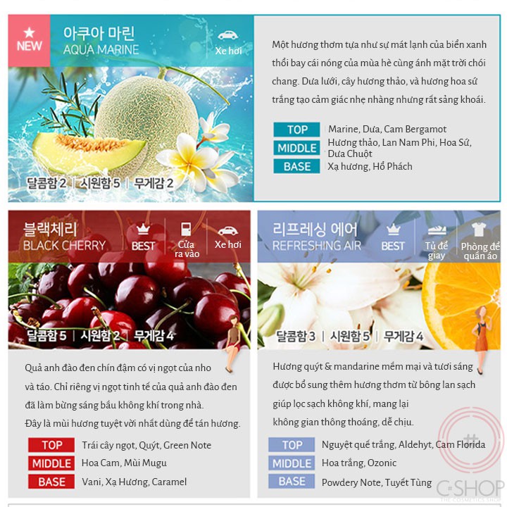 🍀 Aqua - Black Cherry: Mùi hương ngọt ngào đến từ quả cherry chín mọng; thích hợp sử dụng trong xe hơi và cửa ra vào trong nhà.
