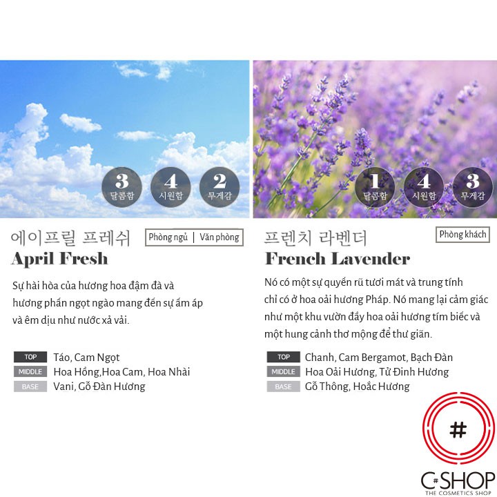🍀 April Fresh: Mang lại cảm giác mùi hương ấm áp và êm dịu như nước xả vải; phù hợp sử dụng trong phòng ngủ và văn phòng.