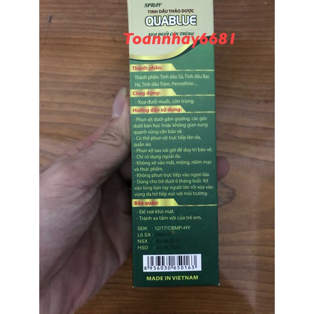 Sức Khỏe > Chăm sóc cá nhân > Chống muỗi & xua đuổi côn trùng || TINH DẦU THẢO DƯỢC QUABLUE(XUA ĐUỔI CÔN TRÙNG CHO PHỤ NỮ CÓ THAI VÀ TRẺ SƠ SINH)Còn hàng