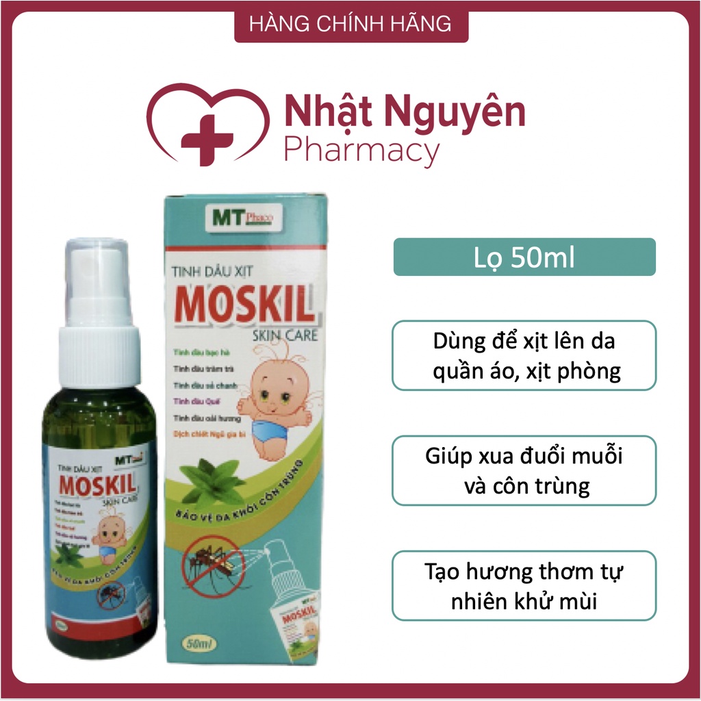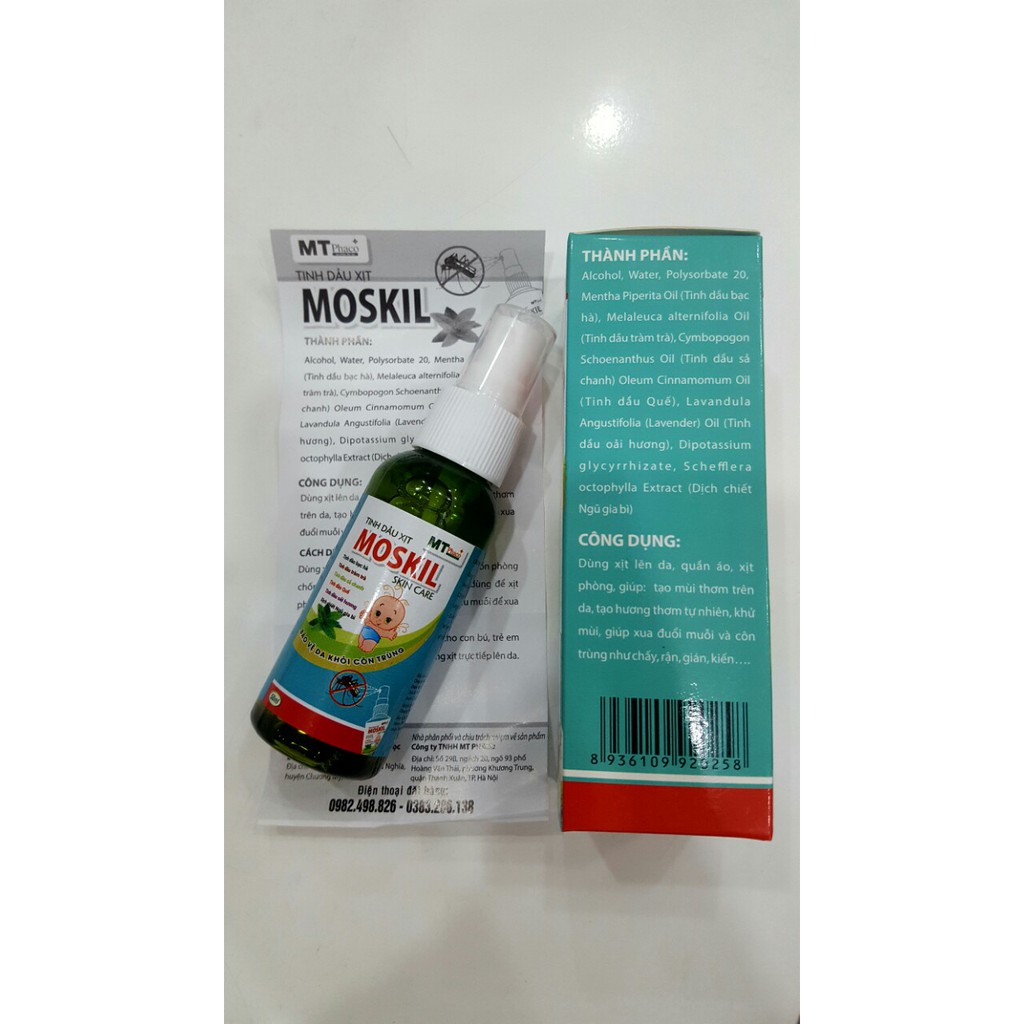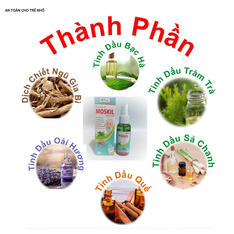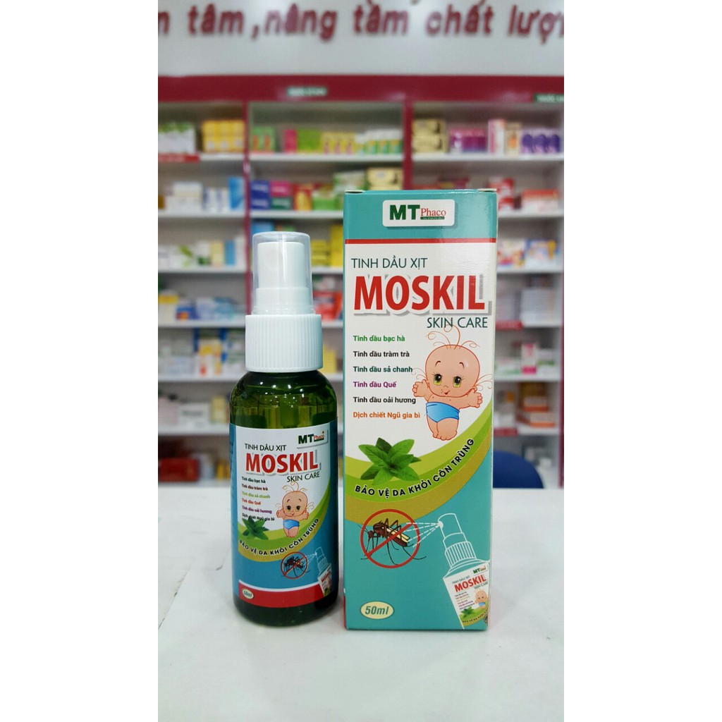 - Tinh dầu xịt MOSKIL với các thành phần từ tinh dầu bạc hà, tinh dầu quế, tinh dầu sả chanh, tinh dầu tràm trà, tinh dầu oải hương, dịch chiết ngũ gia bì được sản xuất theo tiêu chuẩn do cục Dược cấp, bởi nhà máy chuẩn GMP bộ y tế mang lại hiệu quả vượt trội trong việc xua đuổi muỗi, côn trùng, ngăn ngừa cách bệnh lây nhiêm như: virus ZIKA, dịch sốt xuất huyết....