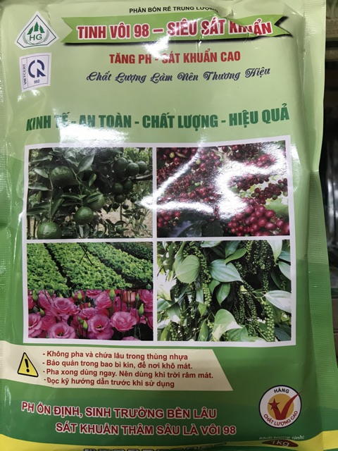 Tinh vôi 98 là sản phẩm được sử dụng hiệu quả trong việt cải tạo đất nông nghiệp, sát khuẩn cao. Sản phẩm là tinh vôi chứa 98% CaO chứ không phải như vôi thông thường chỉ chứa 20-30% Cao (khi sờ vào thấy cứng như xi măng)Thành phần chứa đến 82% Cao (nên được gọi là tinh vôi chứ không phải vôi thông thường)