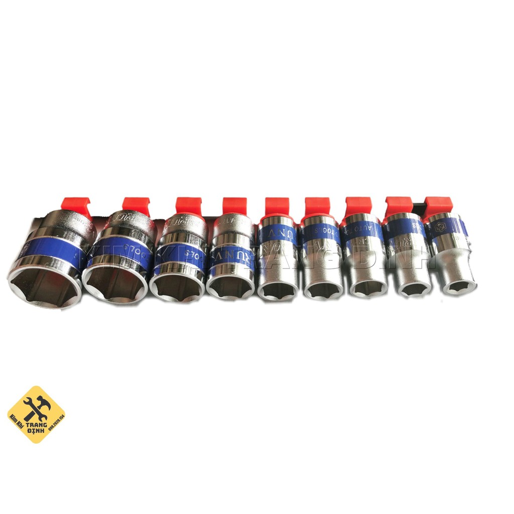 Bộ đầu tuýp 1/2" gồm 9 size khác nhau: 8mm, 10mm, 12mm, 13mm, 14mm, 17mm, 19mm, 22mm, 24mm,Cần tự động đầu vuông ½” (36 răng); cán bọc nhựa cao cấp