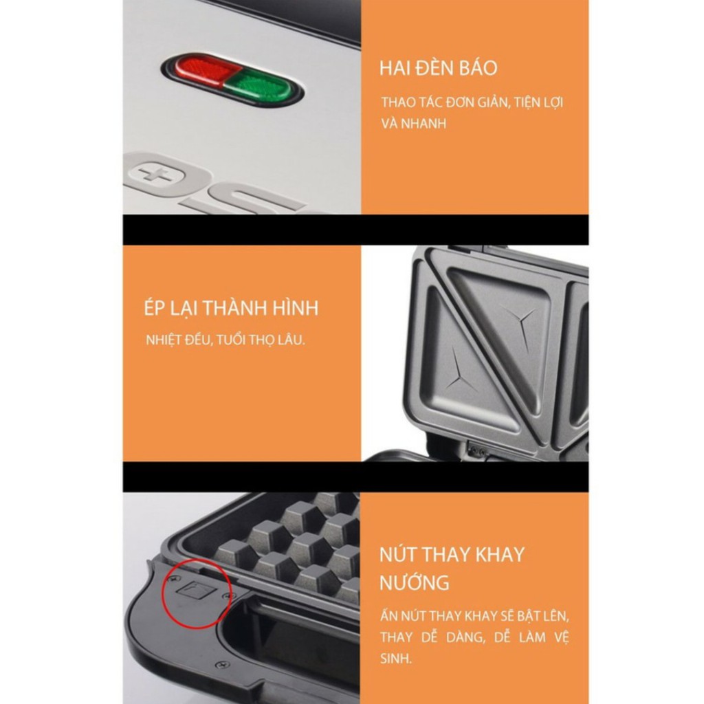 Có 3 chức năng: Nướng bánh Sandwich, Bánh mỳ kẹp, Bánh waffle