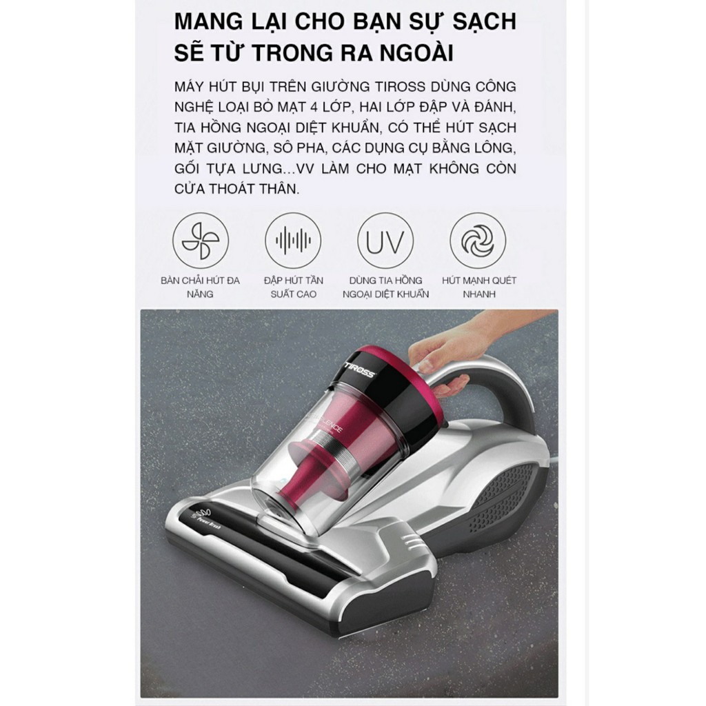 Máy hút bụi trên giường Tiross TS9305 - Bảo vệ giấc ngủ của bạnNhững hạt bụi nhỏ hay vi khuẩn nhỏ li ti luôn là nỗi ám ảnh của bất kỳ một ai bởi chúng gây ra những bệnh về da rất khó chịu nhưng giờ đây bạn sẽ không cần phải lo lắng bởi sự xuất hiện của máy hút bụi trên giường
