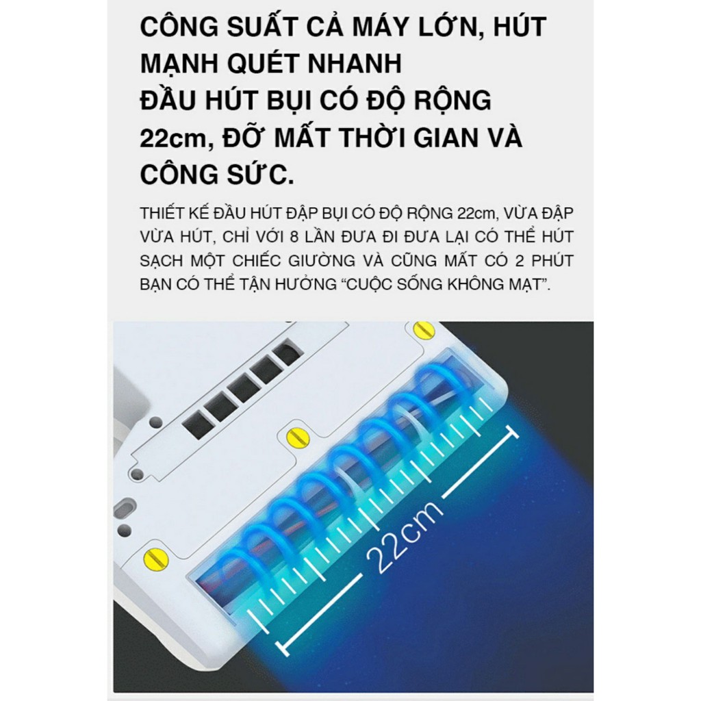 Đầu hút của máy hút bụi cầm tay được thiết kế với kích thước là 22cm, lớn hơn nhiều so với các dòng máy hút khác trên thị trường. Kích thước này cho phép người sử dụng không mất quá nhiều công sức hay thời gian chỉ để dọn dẹp lũ mạt trên chăn gối.
