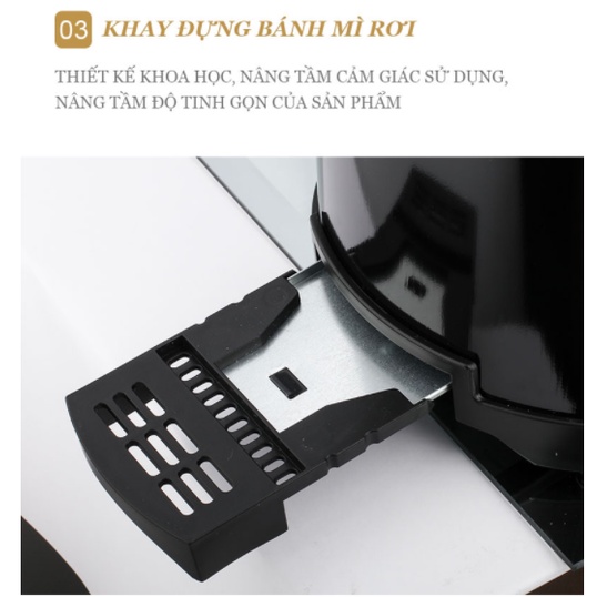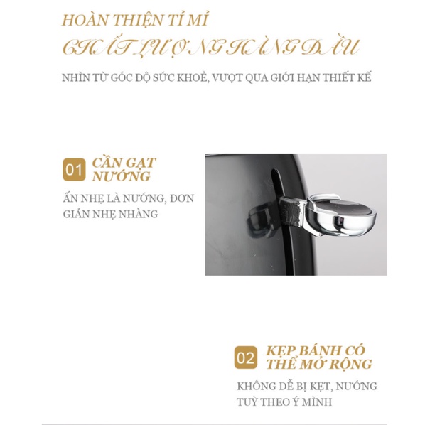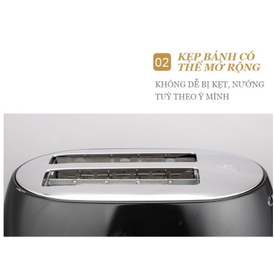 Kẹp bánh có thể mở rộng, không để bánh bị kẹt. Máy trang bị khay đựng bánh mỳ rơi tiện lợi. Chỉ với thao tác gạt cần nướng bạn sẽ nhanh chóng hoàn thiện bữa sáng của mình chỉ trong vài phút, giúp tiết kiệm thời gian.