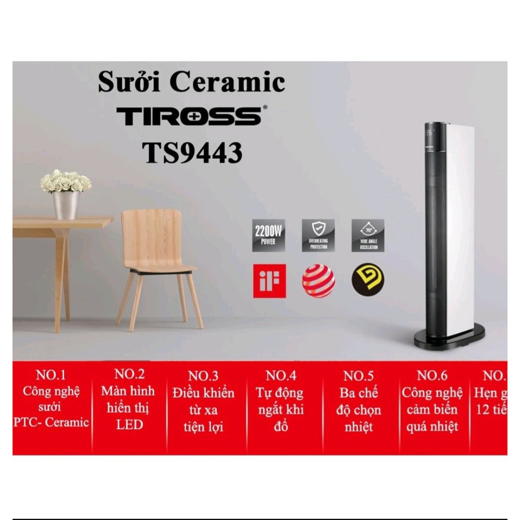- TS9443 là dòng máy sưởi gốm đến từ thương hiệu Tiross. Máy có thiết kế nhỏ gọn và có thể sử dụng quanh năm với độ bền cao, mang lại sự tiện nghi cho người dùng.