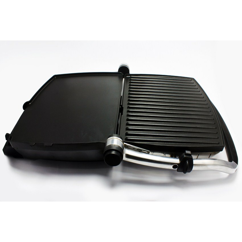 Khi mở ra 180 độ bạn có thể sử dụng như 1 chiếc vỉ nướng điện thông thường với 2 bên khay nướng với 2 nút điều chỉnh nhiệt độ khác nhau