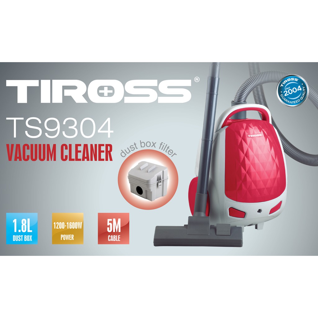 Máy hút bụi Tiross TS9304 là dòng máy hút bụi gia đình được sản xuất tại Malaysia với công suất hoạt động 1200-1600W sử dụng hộc chứa bụi tiện lợi