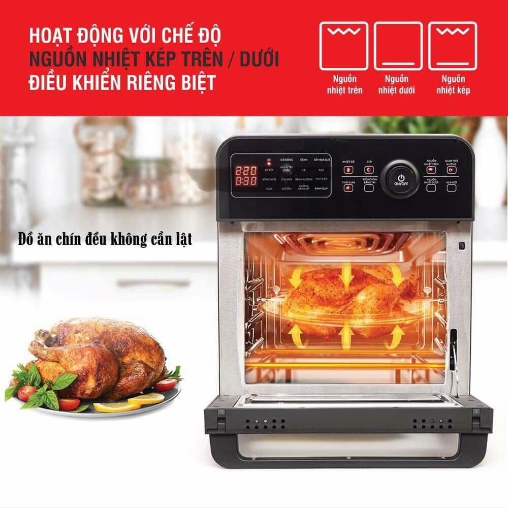 Theo đó không khí bên trong lò sẽ được làm nóng bằng 2 nguồn nhiệt (thanh mai so) trên dưới, sau đó được luân chuyển khắp thực phẩm giúp thực phẩm chín đều, chín kỹ, giữ được độ mềm, ngọt của món ăn.