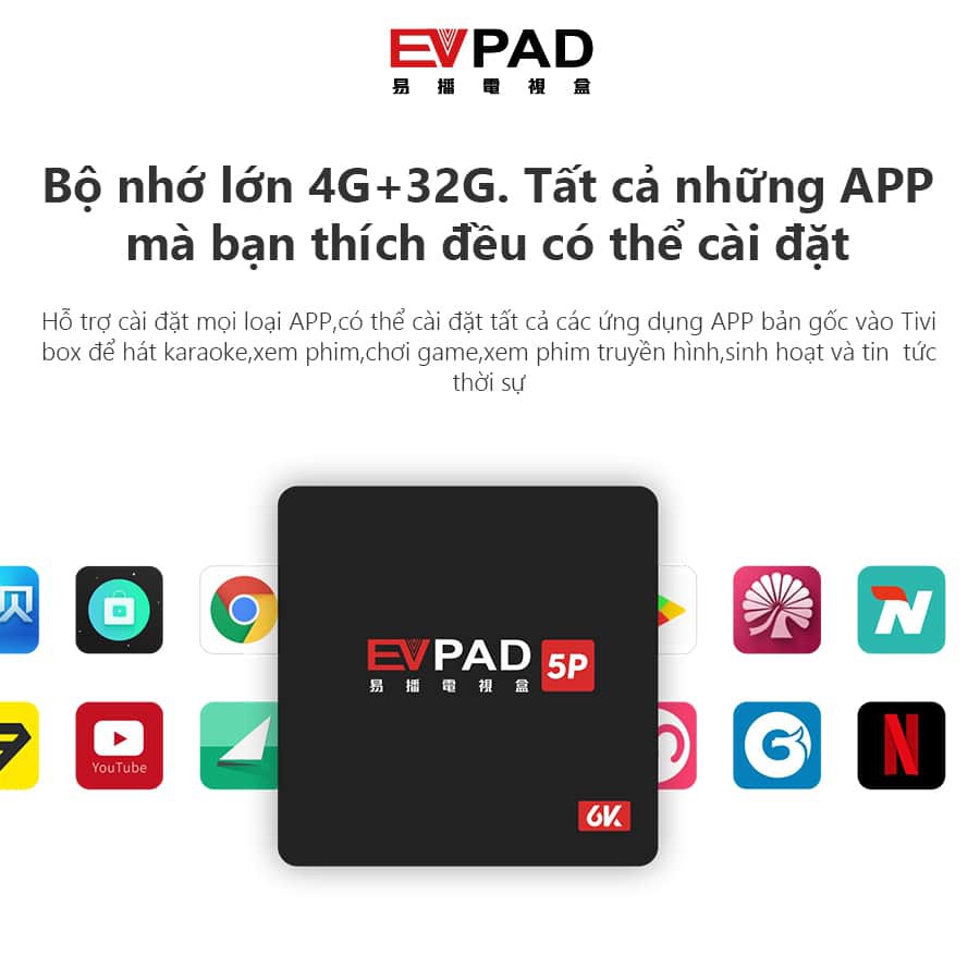 - EVPAD 5P là tv box cho phép xem trên 1000 kênh chất lượng cao các nước Trung Quốc, Nhật Bản, Hàn Quốc, Hồng Kông, Đài Loan, USA , Thái Lan, Ấn Độ , Singapo , Malaysia, Việt Nam... với chất lượng ổn định , Full HD ,đầy đủ kênh nhất hiện nay, hoàn toàn miên phí trọn đời sản phẩm. Điều đặc biệt là thiết bị này cho phép bạn xem những kênh truyền hình kể trên tại bất cứ quốc gia nào trên thế giới chỉ cần có kết nối Internet, phù hợp khi bạn đi công tác , du lịch ở nước ngoài hoặc học tập và thực hành kĩ năng nghe ngoại ngữ một cách vô cùng hiệu quả . Thiết bị rất nhỏ gọn để bạn có thể mang theo (tổng khối lượng chỉ 200Gr).