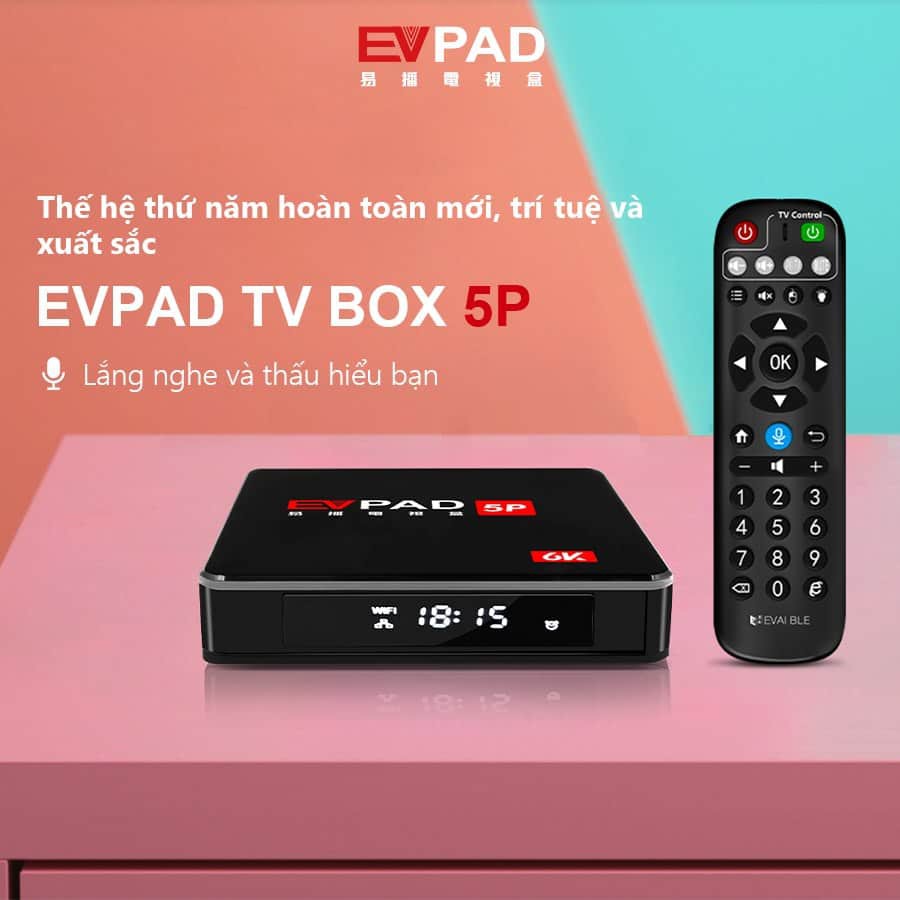 Tivi box EVPAD 5P - Có Remote hỗ trợ Voice - Độ phân giải 6K - Hơn 1000 kênh truyền hình hàng đầu các nước - Miễn phí thuê bao tháng- EVPAD 5P là mẫu sản phẩm tivi box mới nhất thuộc Seri thiết bị EVPad xem truyền hình nước ngoài qua giao thức IPTV . So với các thiết bị tiền nhiệm thì năm nay EVPAD 5P đã được nâng cấp rất nhiều về phần cứng để đáp ứng được các tiêu chuẩn mới về hình ảnh, âm thanh và tốc độ xử lý. (CPU lõi tứ Cortex A53 với GPU MALI-T720MP2, độ phân giải 6K, âm thanh vòm DOBLY & DTS, 4G DDR3 + 32G EMMC, WiFi băng tần kép, giải mã H.265, hệ thống EVOS 3.0, HDR 10 và HLG HDR.)