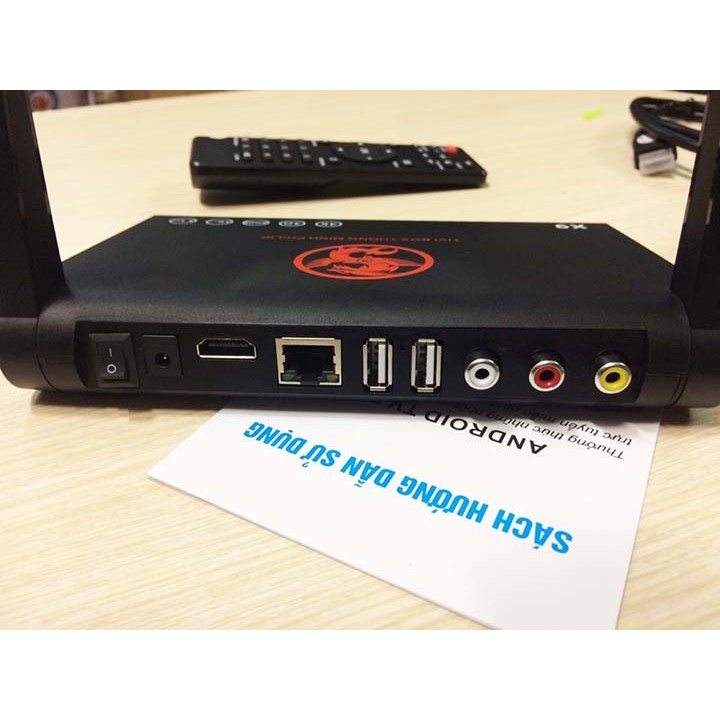 Phía mặt sau tivi box X9, các cổng kết nối, công tắc nguồn, nguồn đầu vào DC, khe cắm HDMI, khe cắm LAN, 2 cổng USB, bộ cổng AV.