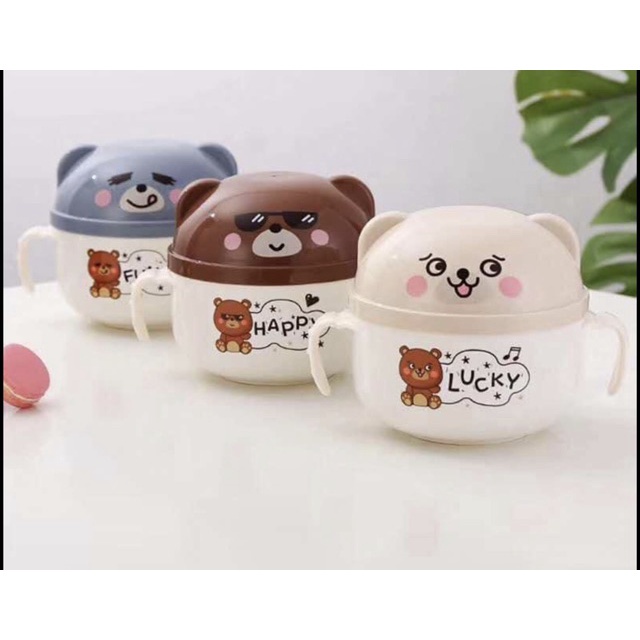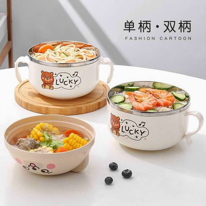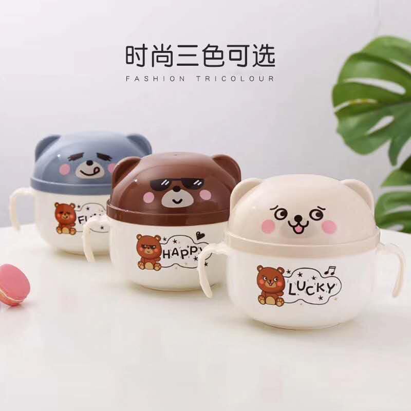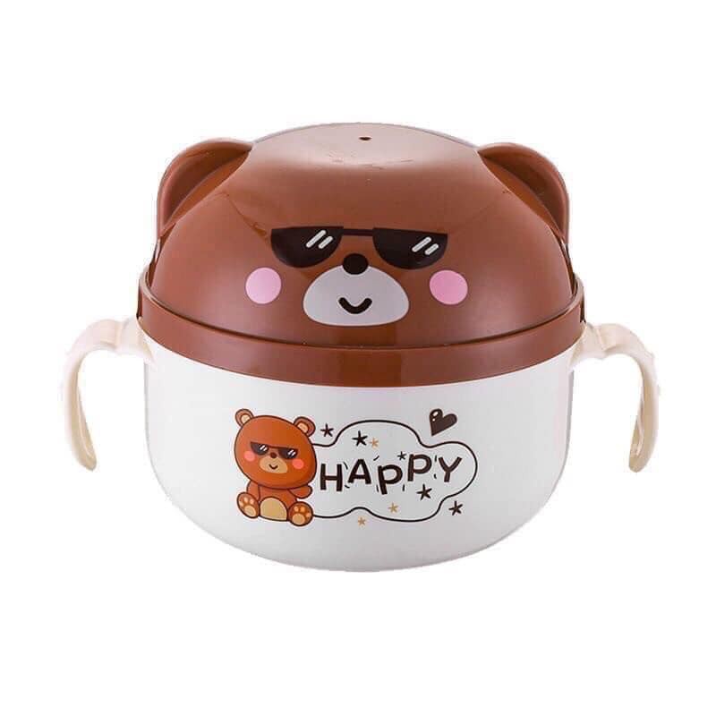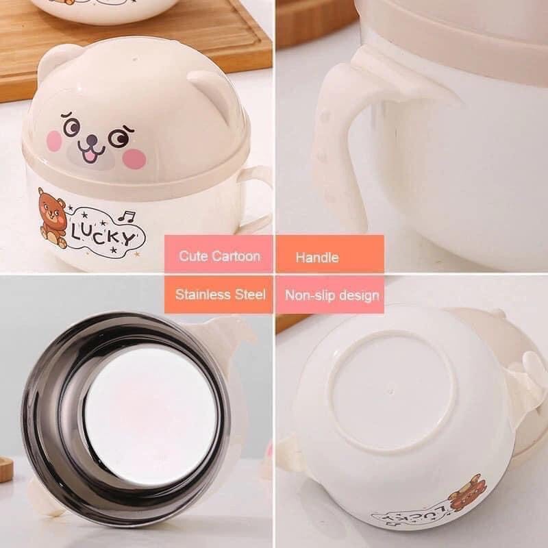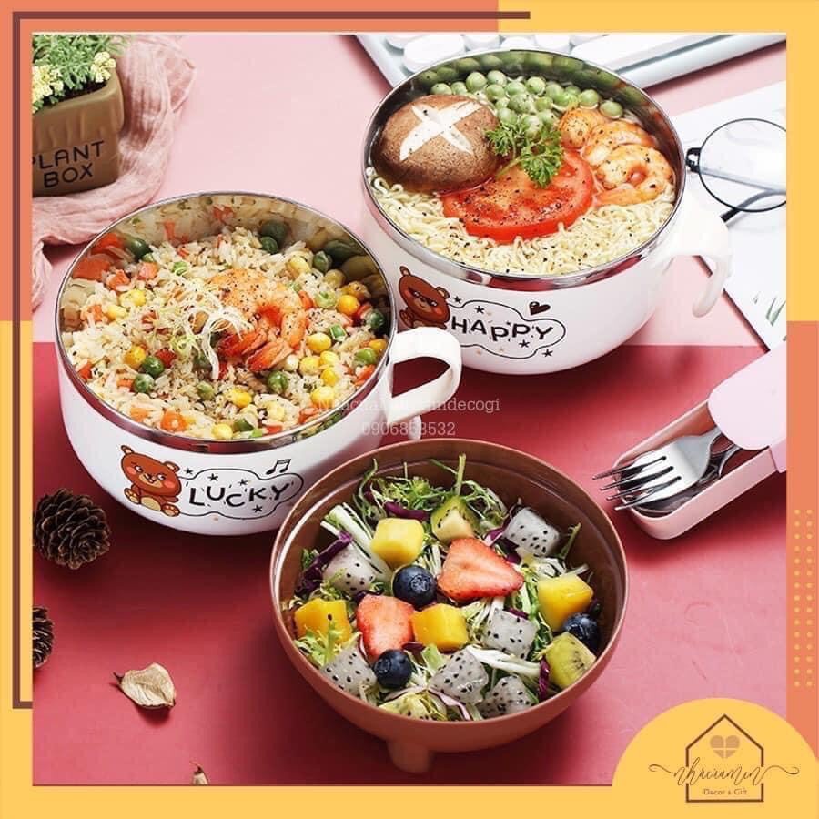 Nhà cửa & Đời sống > Bộ đồ bàn ăn > Tô || Tô bát ăn mì tôm có nắp đậy có tay cầm cute hàn quốc hình gấu kèm thìa hai lớp inox chống nóng an toàn AZ SA732Còn hàng
