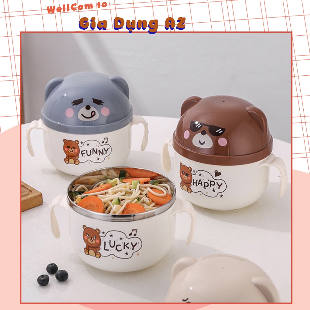 Tô bát ăn mì tôm có nắp đậy có tay cầm cute hàn quốc hình gấu kèm thìa hai lớp inox chống nóng an toàn AZ SA732