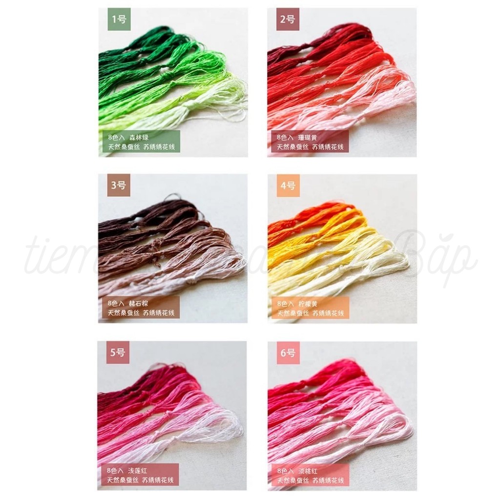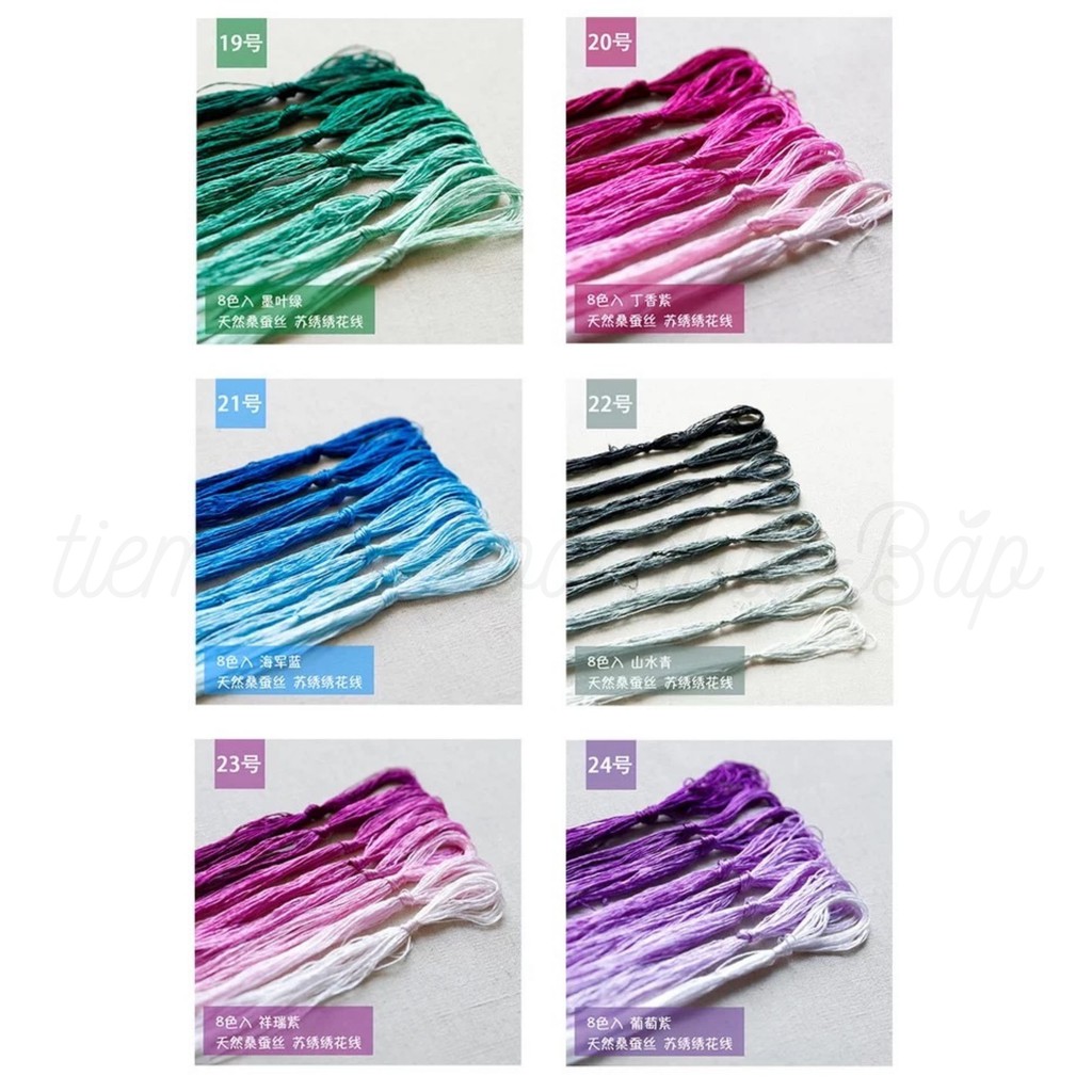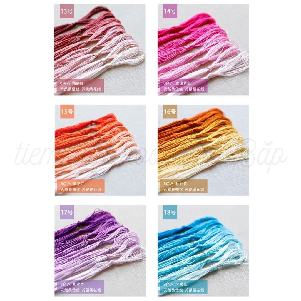 Set chỉ bóng Tô Châu gồm 25 set màu tất cả, 8 màu một set và mỗi màu khoảng 20m.Khác với chỉ tơ Việt Nam, chỉ tơ Tô Châu là chỉ truyền thống của Trung Quốc = được se từ 100% sợi tơ tằm nên giá cao hơn chỉ thêu cotton thường hay chỉ tơ bóng của Việt Nam. Sợi chỉ mảnh, mong manh, mềm và sờ vào rất thích!