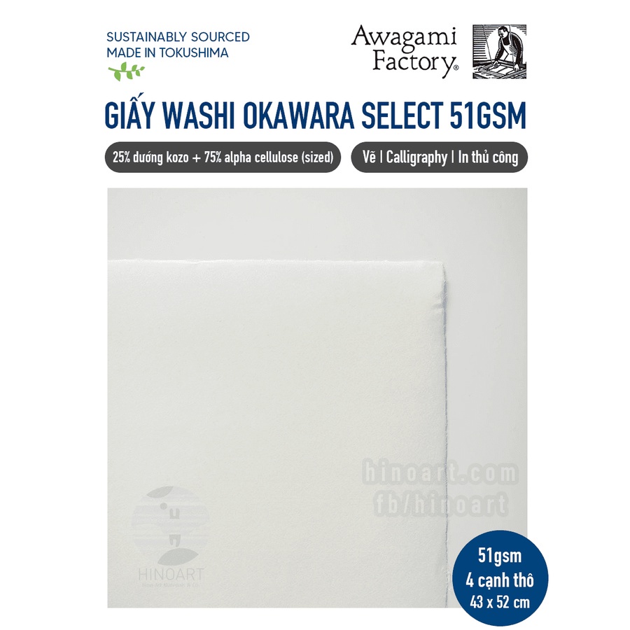 Giới thiệu [TỜ LẺ] Giấy washi Awagami Okawara Select 51gsm khổ 21,5 x 26cm 4 cạnh thô (chuyên dụng cho printmaking)