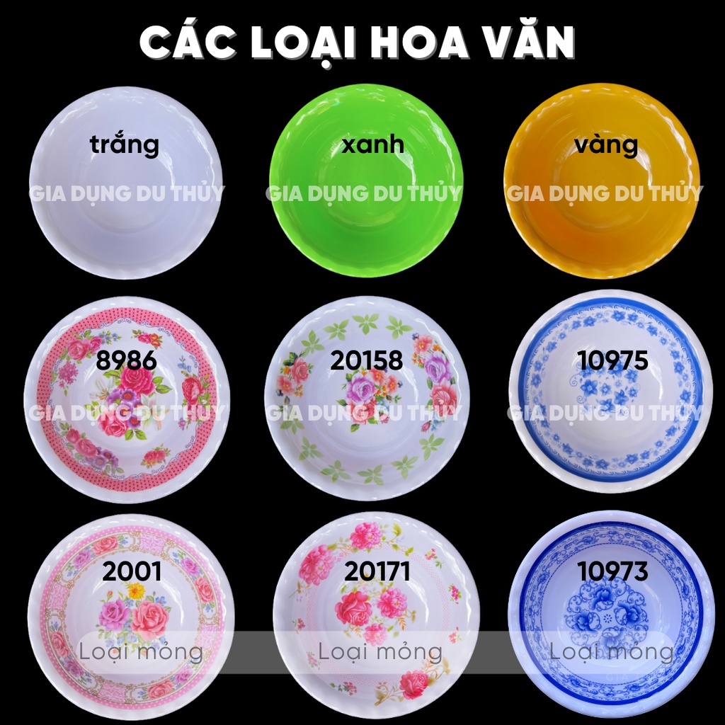 Nhà cửa & Đời sống > Bộ đồ bàn ăn > Tô || Tô melamine nhựa phíp loại tô sâu xoắn màu trắng, vàng, xanh lá và hoa văn của tổng kho gia dụng Du ThủyCòn hàng