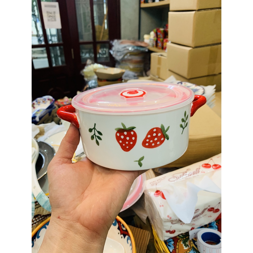 Tô mì bằng sứ kèm nắp - Họa tiết dâu tây, chất sứ cao cấp, an toàn khi sử dụng