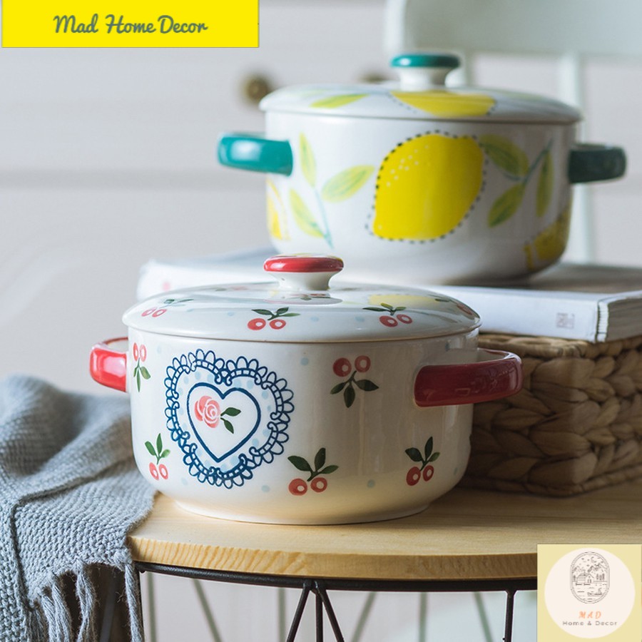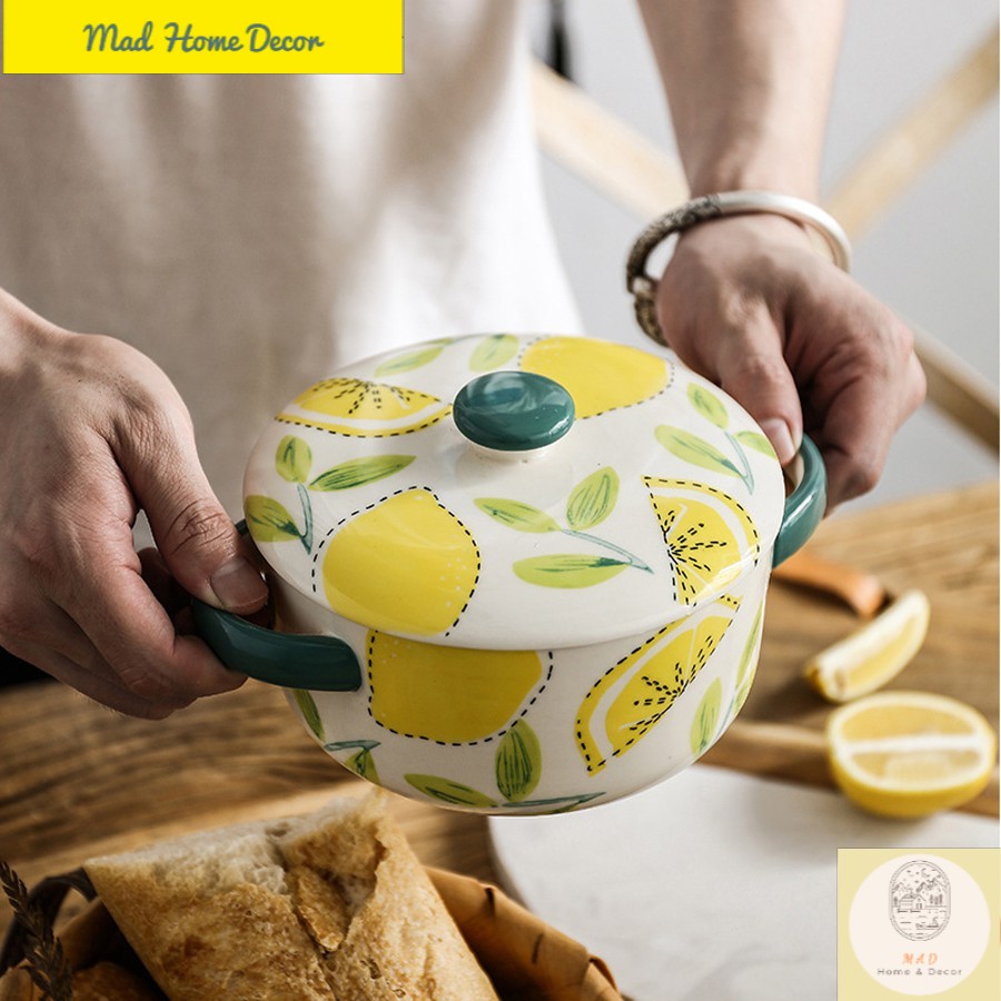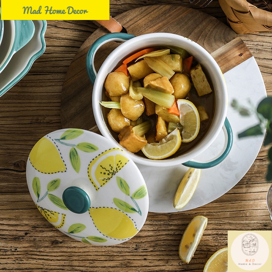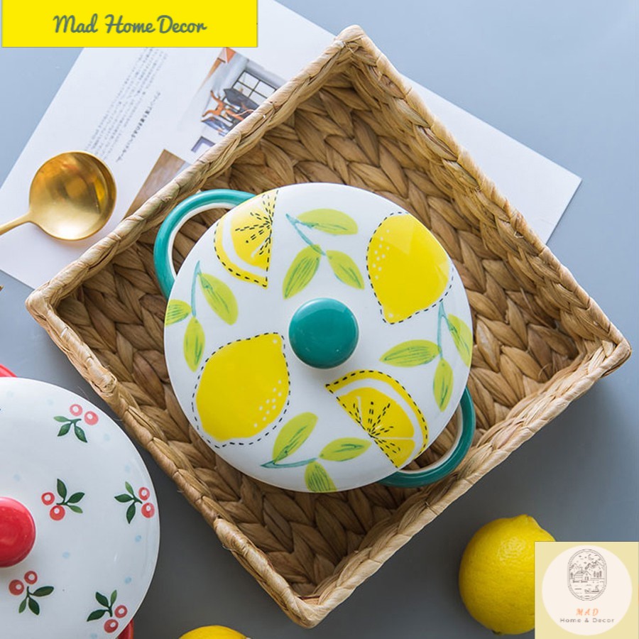 Nhà cửa & Đời sống > Bộ đồ bàn ăn > Tô || Tô sứ ăn mỳ,bát ăn dặm có 2 tay cầm kèm nắp họa tiết chanh vàng cherry đỏ 850ml .Còn hàng