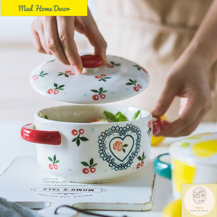 Tô sứ ăn mỳ,bát ăn dặm có 2 tay cầm kèm nắp họa tiết chanh vàng cherry đỏ 850ml .