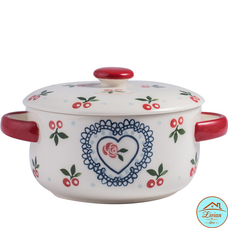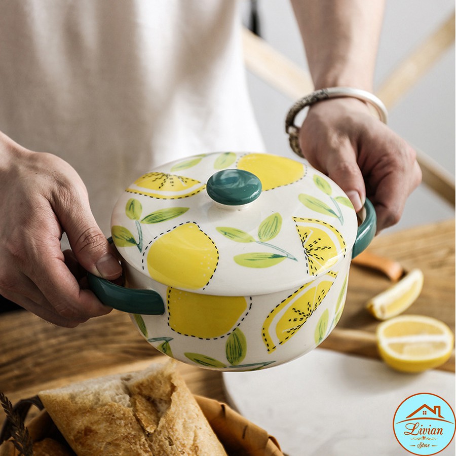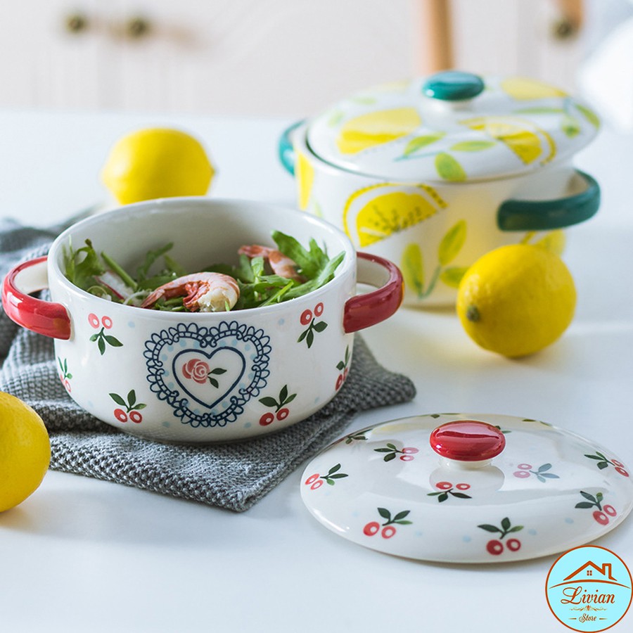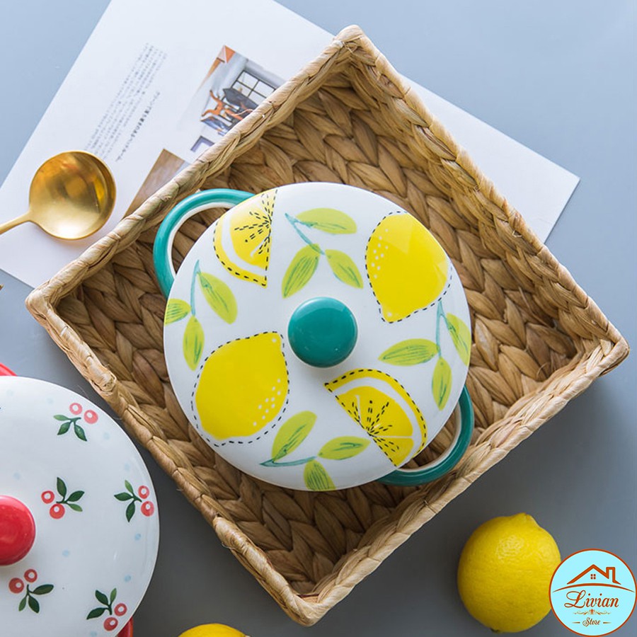 Nhà cửa & Đời sống > Bộ đồ bàn ăn > Tô || Tô sứ ăn mỳ,bát ăn dặm có 2 tay cầm kèm nắp họa tiết chanh vàng cherry đỏ 850ml .Còn hàng