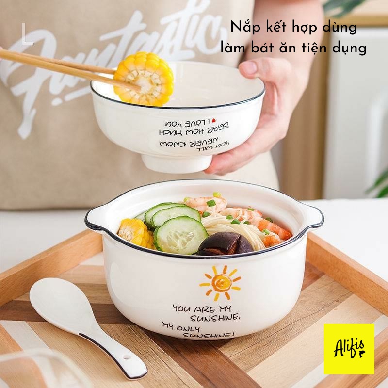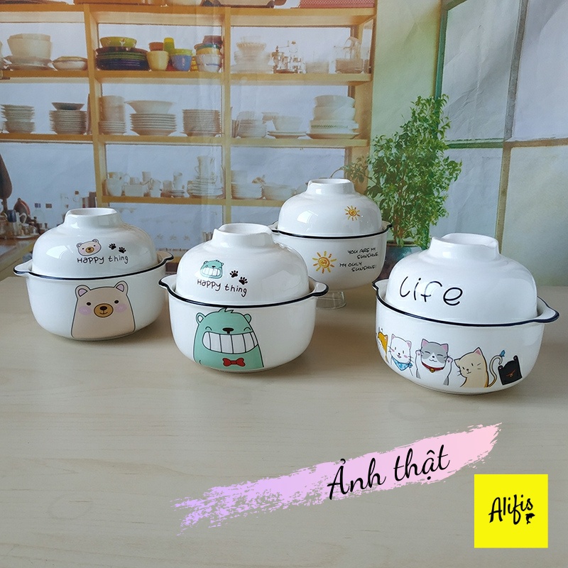 Tô mì, bát ăn phở, bún có nắp kèm thìa bằng sứ hoạ tiết ngộ nghĩnh siêu dễ thương Alifis