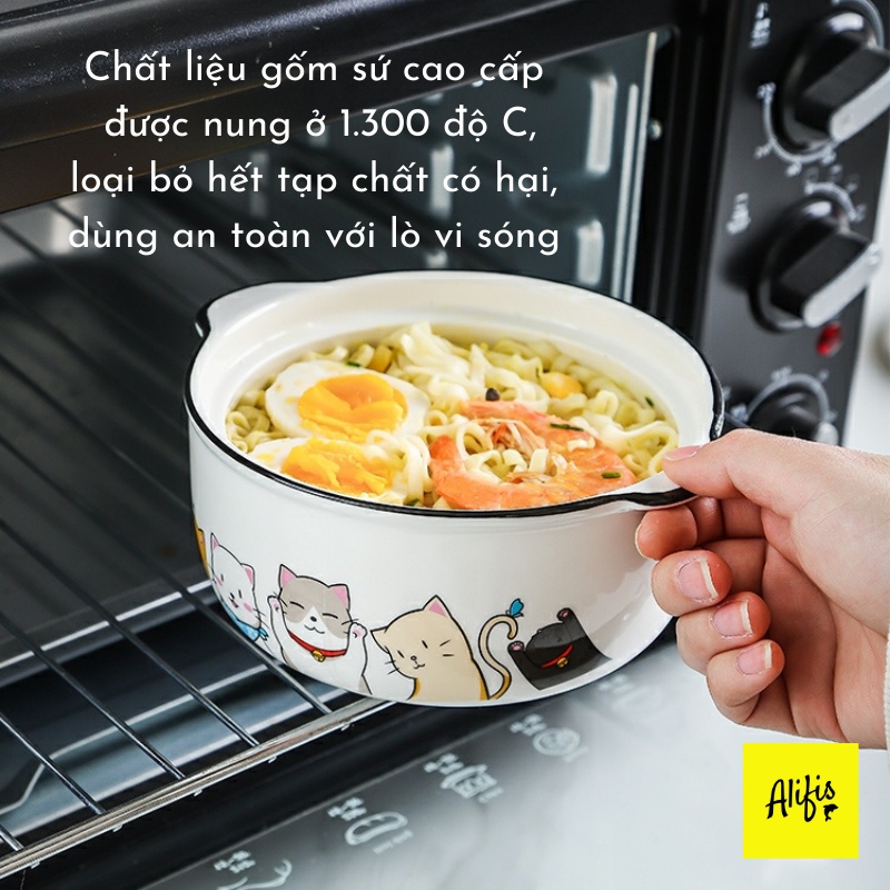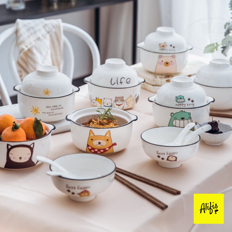 Giới thiệu Tô mì, bát ăn phở, bún có nắp kèm thìa bằng sứ hoạ tiết ngộ nghĩnh siêu dễ thương Alifis
